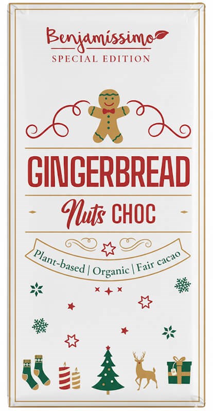 Rajoitettu erä! Benjamissimon suussa sulava talvinen vegaaninen luomusuklaa, jossa maisuvat rapeat pähkinät sekä jouluisat piparkakkumausteet. Ihastuttava lahjaidea tai täydellinen seuralainen omiin herkkuhetkiin.